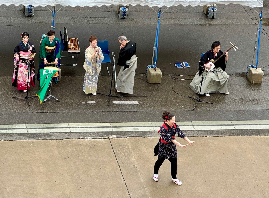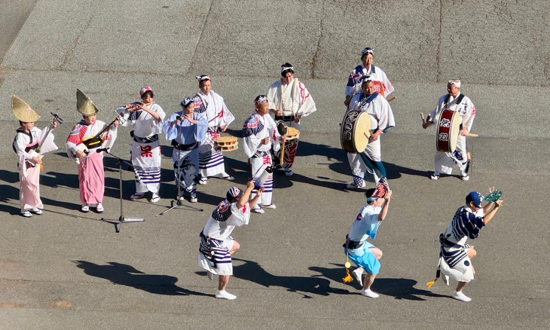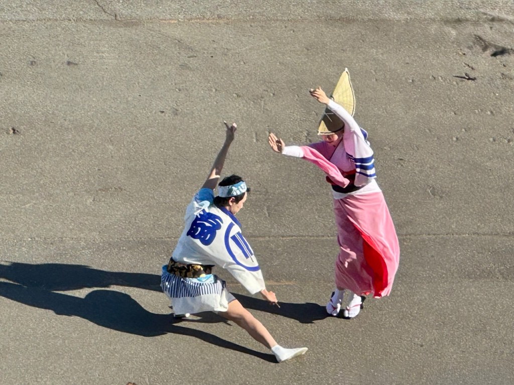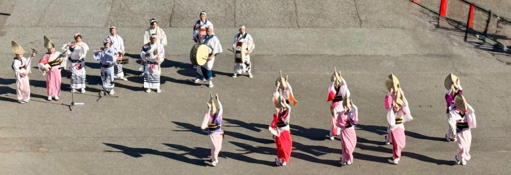 Awa Odori is accompanied by traditional instruments like shamisen (lute), taiko drums, shinobue flute, and kane bells. Dancers chant and sing while performing. Pretty interesting.