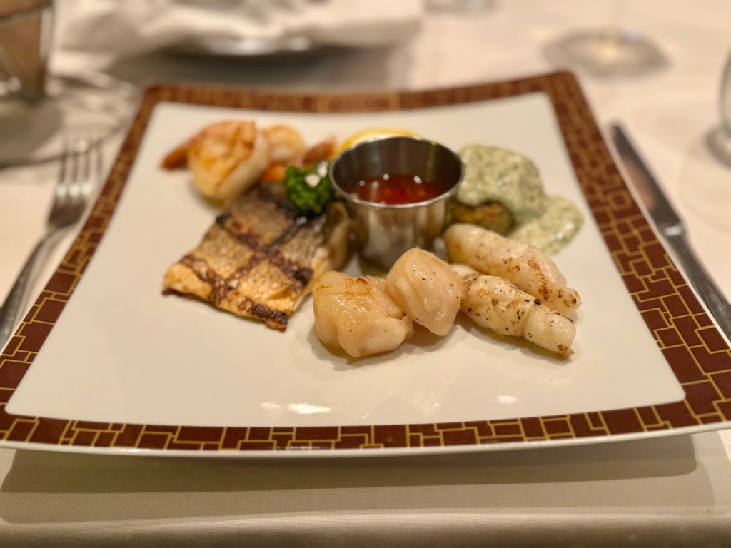 I had dinner in Cagney’s Steakhouse but as it’s Good Friday I checked out their seafood!! The jumbo shrimp cocktail and grilled seafood platter featuring scallops, shrimp, calamari, branzino and a crab cake was more than filling.