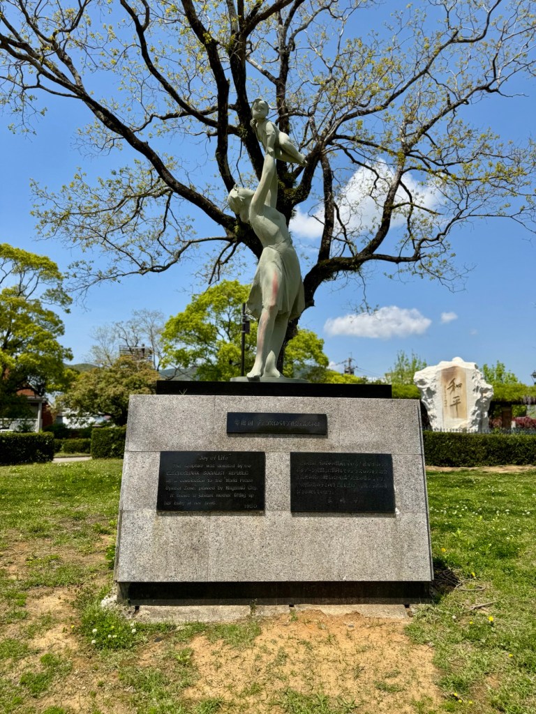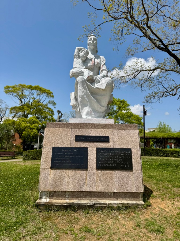 The Statue of a Mother depicts a tender mother wearing the national wartime attire; the modeled kimono. On the back of this statue, there is an inscription: “Mother and son will be together forever.”