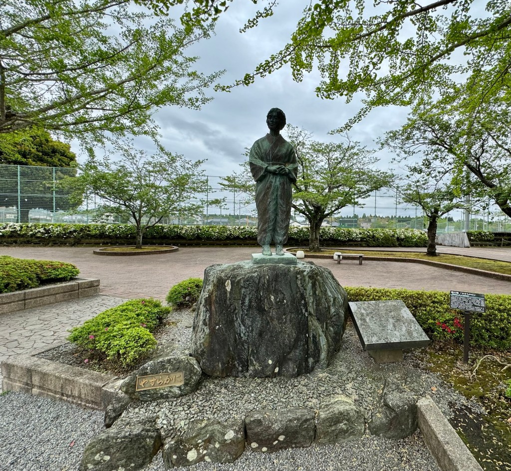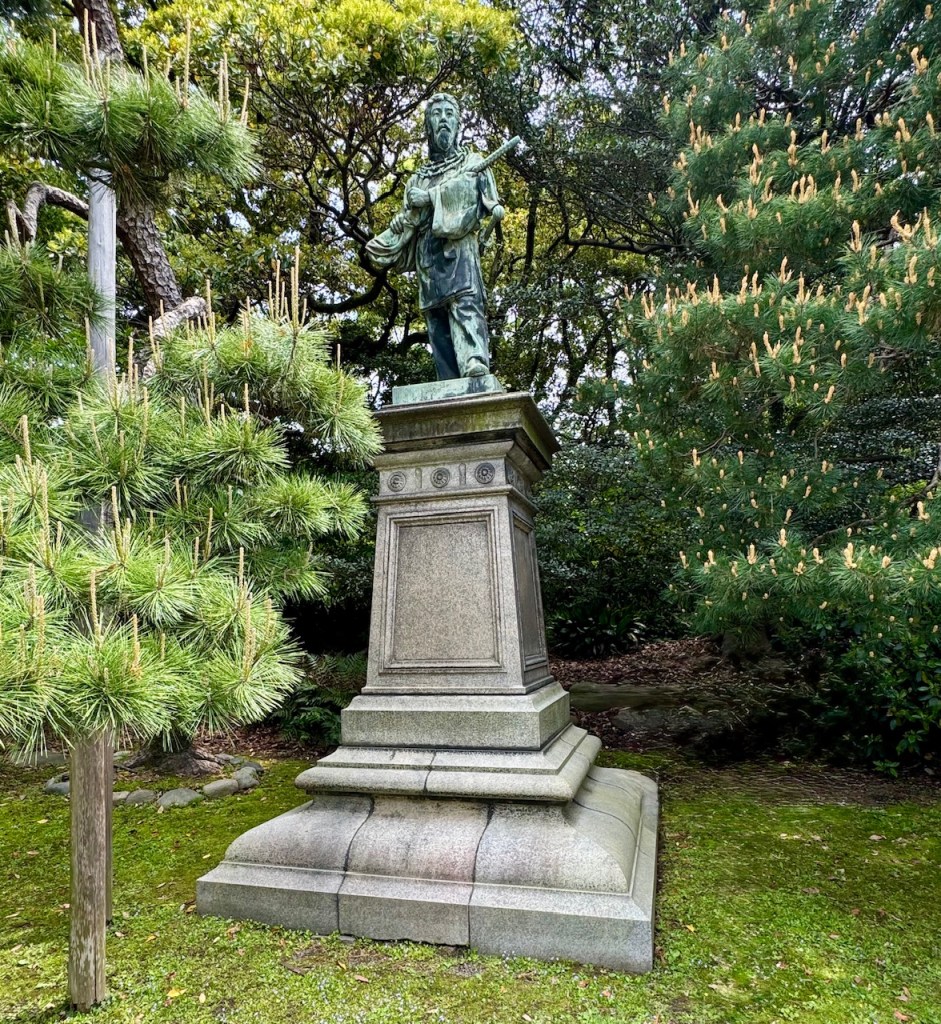 The Meiji Monument, featuring a bronze statue of the legendary hero Yamato Takeru in the center. It was erected in 1880 in memory of the local soldiers who died in the Seinan War, a rebellion of disaffected samurai against the new government and the Meiji Restoration.