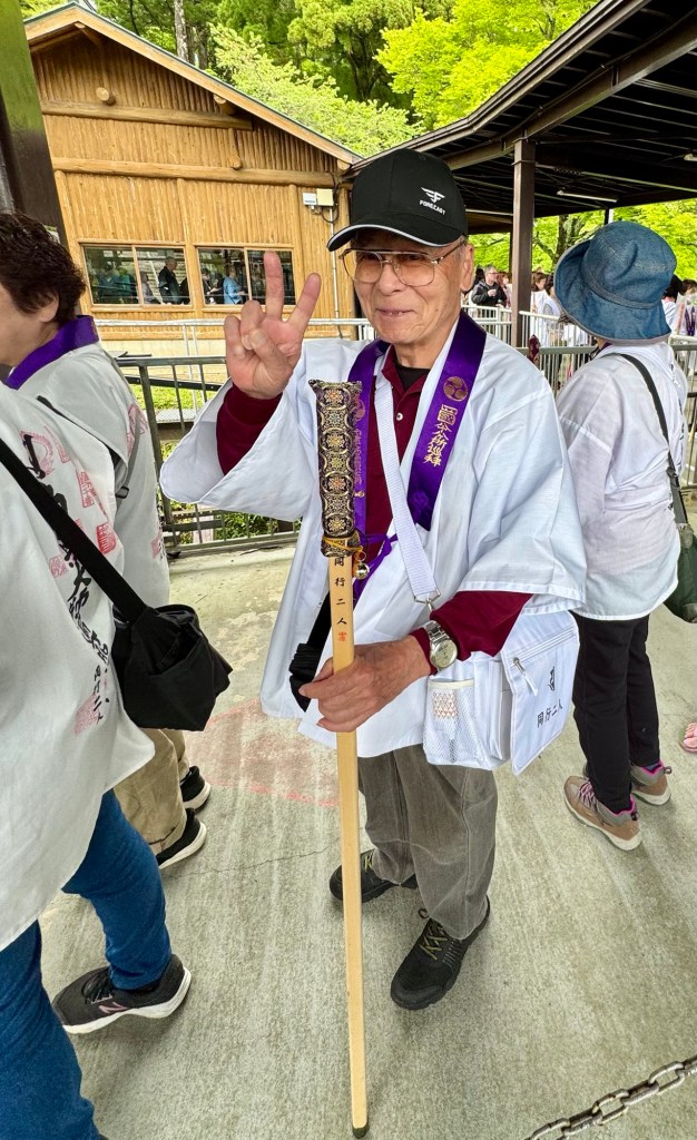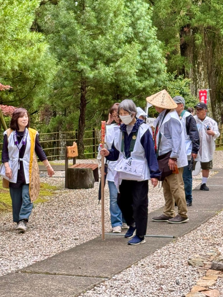 Pilgrims wear a three-piece set of white robes, a ‘wagesa’ stole—a band of coloured cloth hung around their neck—and also carry a pilgrim’s staff. The white robes have historical significance, tracing their origins back to the harsher Shikoku 88 Temple Pilgrimage of the past. During that time, people would wear burial clothes in advance, hoping to attain nirvana if they lost their lives while on the pilgrimage. The wagesa stole is a simplified version of the kesa stoles worn by monks. The pilgrims’ staffs, which they carry, embody the spirit of Kobo Daishi. They serve as a symbol of the pilgrim’s journey, representing Kobo Daishi’s protection and guidance.