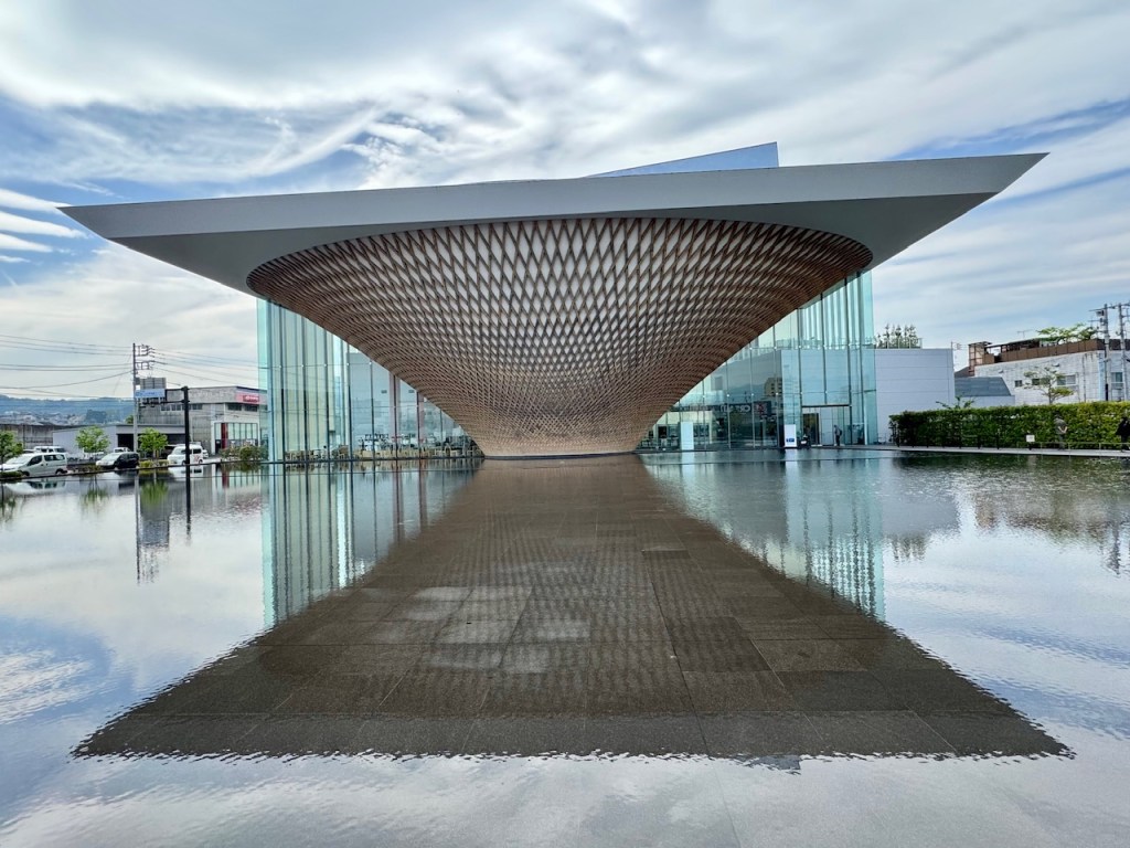 The building has an inverted lattice conical form that reflects in the pond outside to mimic the shape of the iconic mountain. Inside the centre, there is a 200 meter long, sloped walkway that corkscrews up through and around the floors of the building with projections of climbers on the pilgrimage to the summit.