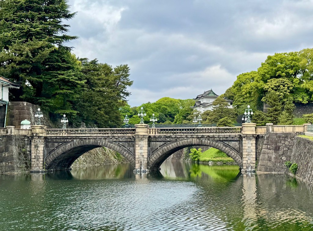 From Kokyo Gaien, the large plaza in front of the Imperial Palace, we can see the Nijubashi, two bridges that form an entrance to the inner palace grounds. The stone bridge in front is called Meganebashi (Eyeglass Bridge). The bridge in the back was formerly a wooden bridge with two levels, from which the name Nijubashi (Double Bridge) was derived.