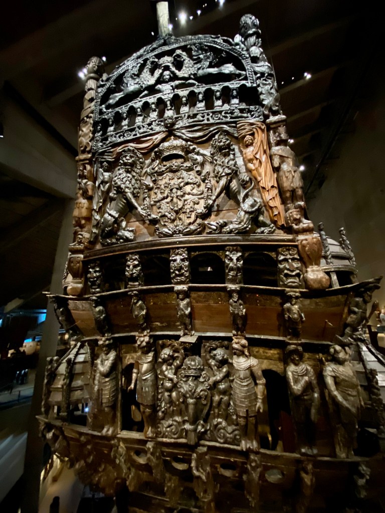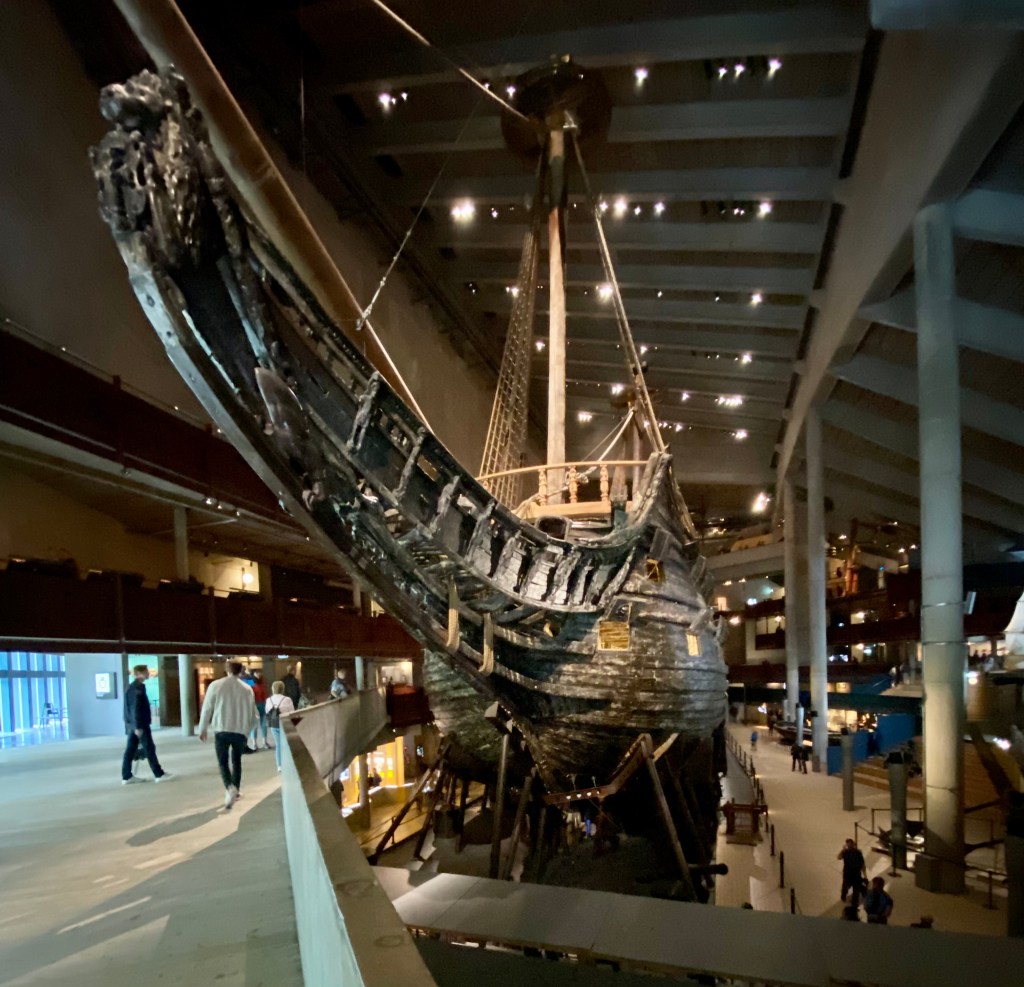 Here we found the well preserved warship Vasa from 1628 embellished with hundreds of wooden sculptures. Vasa was a warship intended to participate in a war in 1620 between Sweden and Polish/Lithuania forces to decide who should be the ruler of Sweden.