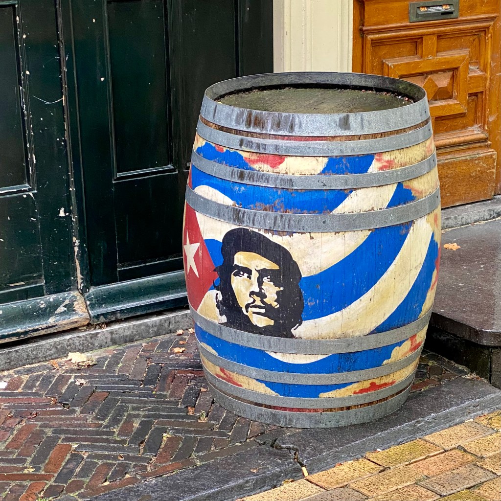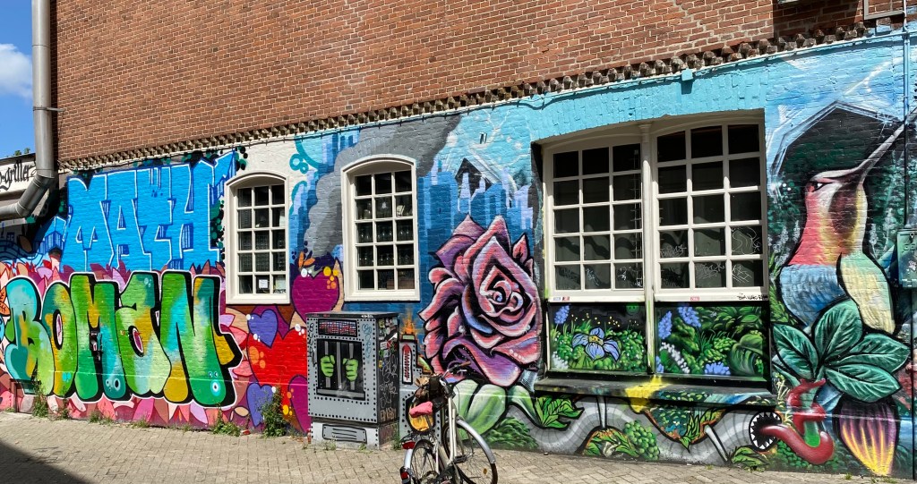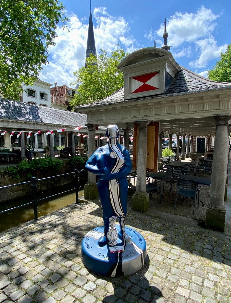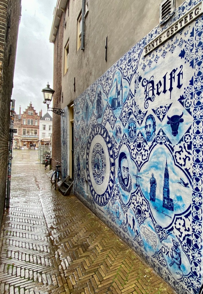 Braving the rain again at least momentarily, I’m off to Bonte Ossteeg to check out Hugo Kaagman’s mural commissioned by the municipality of Delft in 2013. This artwork was inspired by Delft blue motifs with patterns and colours reminiscent of Delft blue tiles. The images in the mural show Delft through the ages.