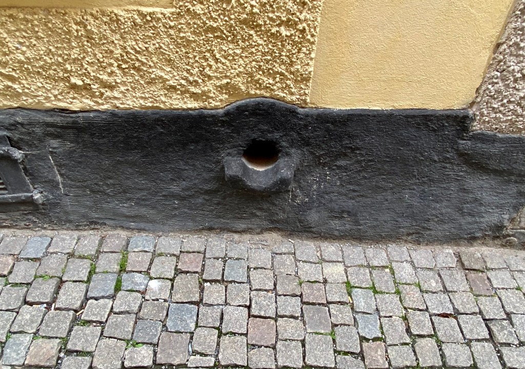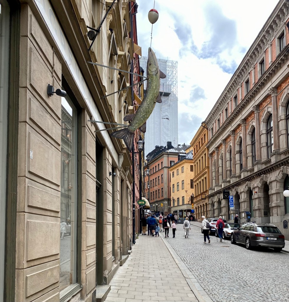 The next stop on the tour was a sewage hole! Back in the day, waste from residences was dropped down a shute then ran into the gutter awaiting a big rain. This was an especially bad system in summer when it could take weeks for enough rain to “flush” the waste. Residents were responsible to keep streets clean so everyone had to wear wooden clogs to stay above the muck. Malin talked about excrement for quite a long while but suffice it to say that the landmass of Stockholm eventually grew by 50% because of waste thrown in the harbour!