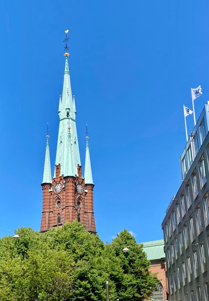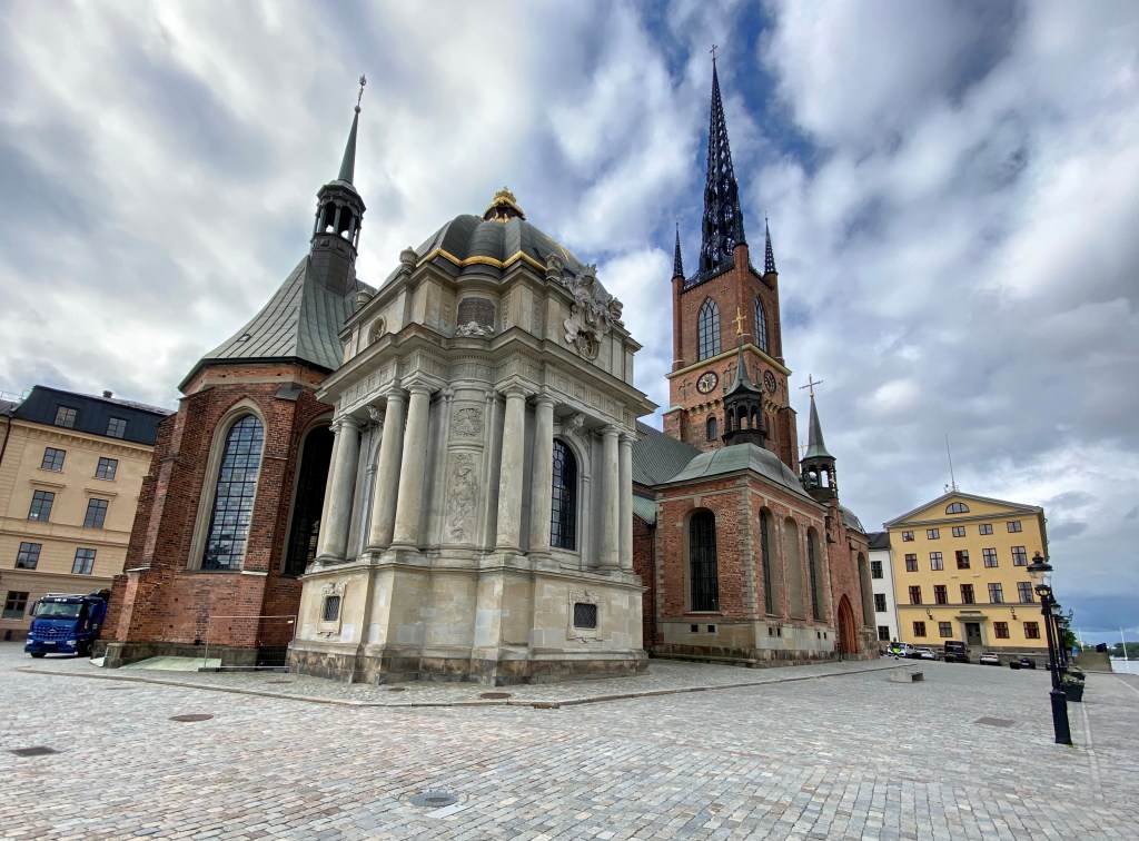 We set out first to Riddarholmen Island (Knight Island) the historical nucleus of Stockholm to check out Riddarholmen Church and environs. The church (the oldest bldg in Stockholm) was part of a Franciscan monastery founded in the thirteenth century. The king chose the church for his last resting place and kings were buried there for hundreds of years in the white circular building.  No one currently living on the island so church is no longer active. The buildings were handed over to the state and now house government departments.