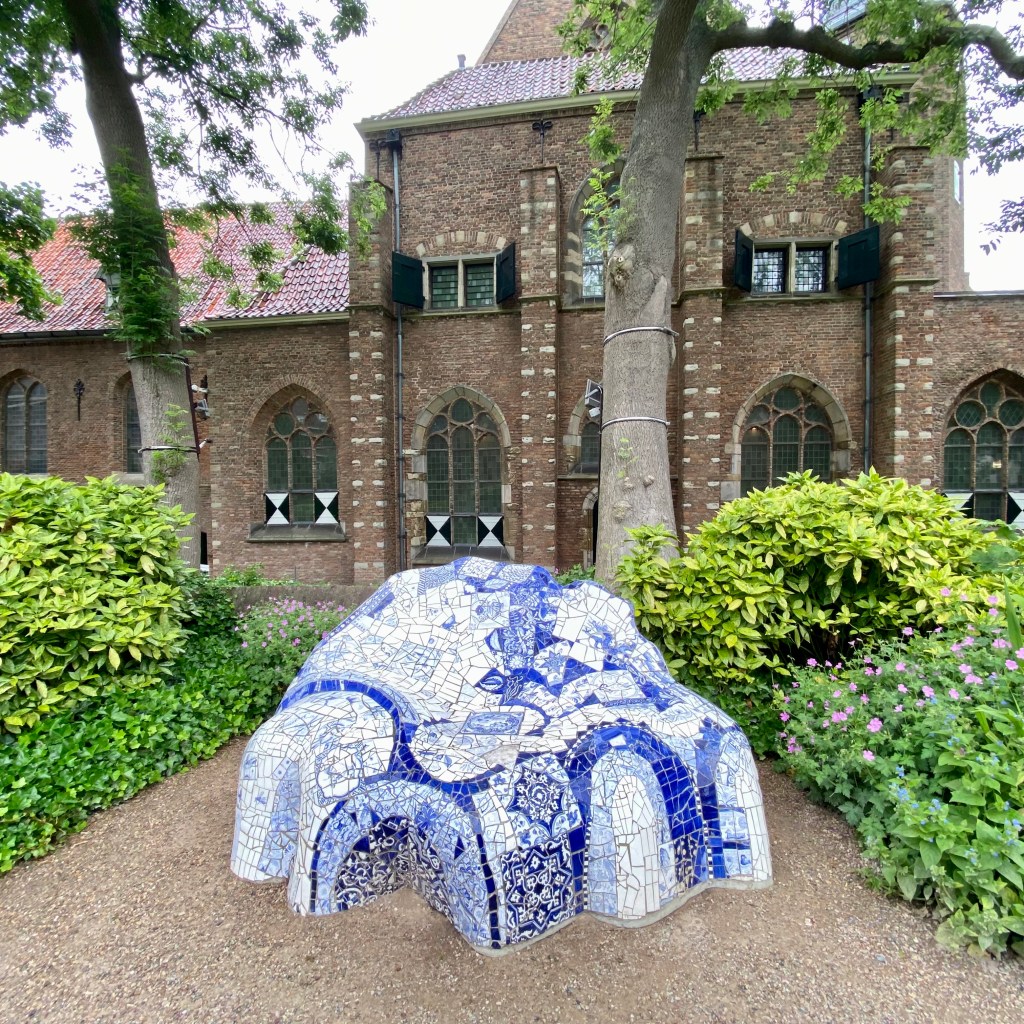 The first installation, Homage to Gaudi; a ceramic Delft blue sofa designed by Marianne Burger’s, is in the Prinsenhof Garden. Delft artist Chris Dagradi created the tiles especially for this sofa which was unveiled in 1988.