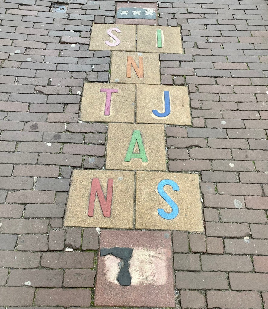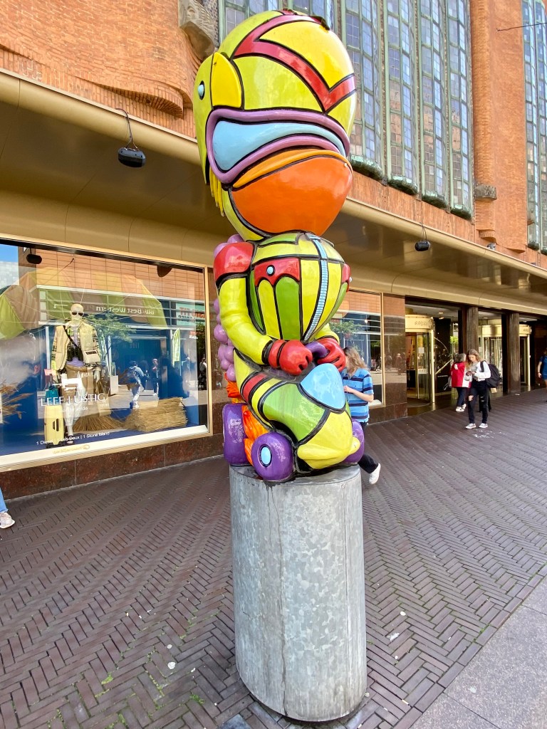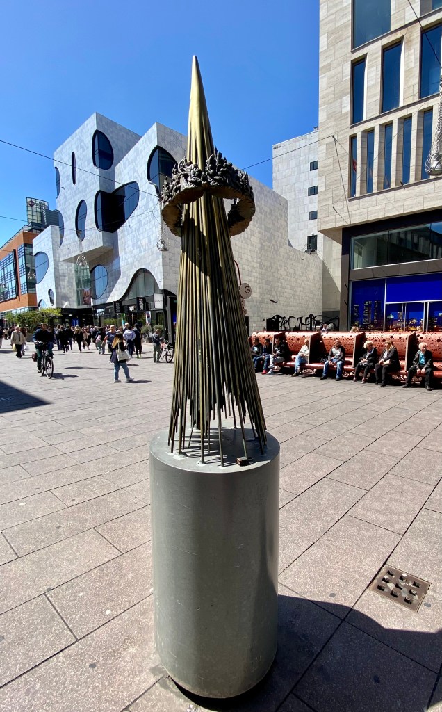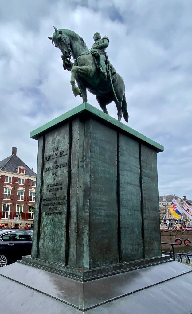 The second was a bronze statue of a young boy on a pedestal. On his arm he is carrying a basket. On his head is a hat with a large feather. His hand is outstretched, and he is pointing toward Binnenhof. The statue is called ‘Jantje‘ which means ‘little John‘ in Dutch and is a representation of John I, Count of Holland who died in 1299 at the age of 15 years old. He was the son of Floris V, Count of Holland who had built an estate on the spot where the Binnenhof stands. Today the statue is wearing a blue and yellow knitted sweater and his basket and headware have been embellished as well. Not sure why but maybe in support of Ukraine?