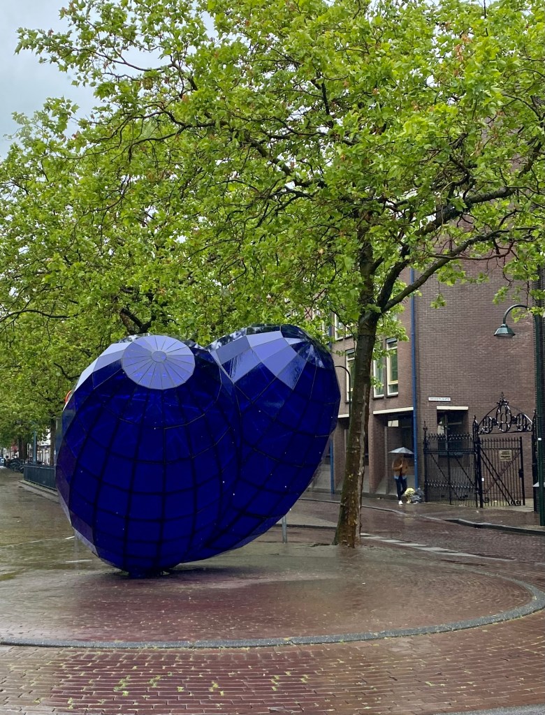 On Oude Langendijk, I found a large delft blue glass heart. Apparently, the sculpture is lit from within at night as an homage to the stained glass of the churches in Delft.