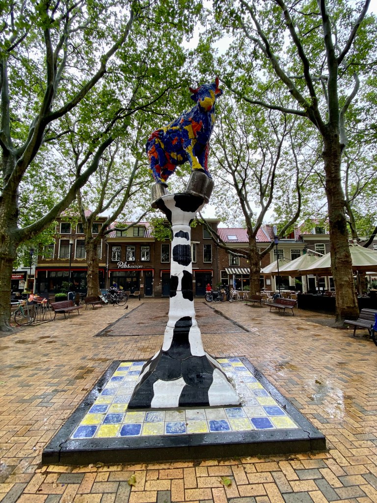 The Beestenmarkt was used as a cattle market from the sixteenth century until 1972. The ‘Delft Cow’ (although some call it a bull) is a reminder of this time. Painted in red, blue and yellow, the cow stands on inverted silver thimbles on a tall column that is white with black spots a reference to the colours of the typical Dutch cow.