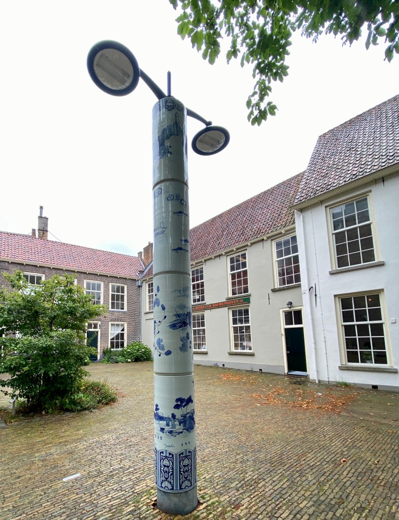Next up also in the museum courtyard (aka Sint Agathaplein) a trio of beautiful porcelain lampposts are nestled among the old chestnut trees. The lampposts feature paintings by Wendy Steenks and Chinese artist Zhang Ling Yun combining traditional Chinese and Dutch motifs with contemporary forms. These porcelain lampposts were made in the Chinese ceramics city of Jingdezhen, a sister city of Delft and the cradle of Chinese porcelain from which Delft blue originated.