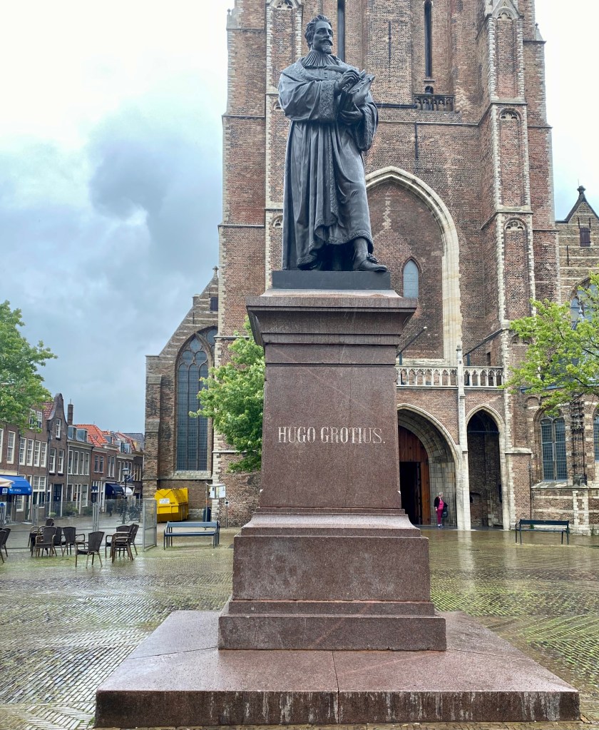 In front of the Nieuwe Kerk is a bronze statue depicting Hugo de De Groot in his role as a jurist. He wears a gown and holds a law book in his hand. He is one of the most famous figures in Dutch history and is considered one of the greatest jurists ever. He is buried in the Nieuwe Kerk in Delft right next to those of his archenemy Prince Maurice.