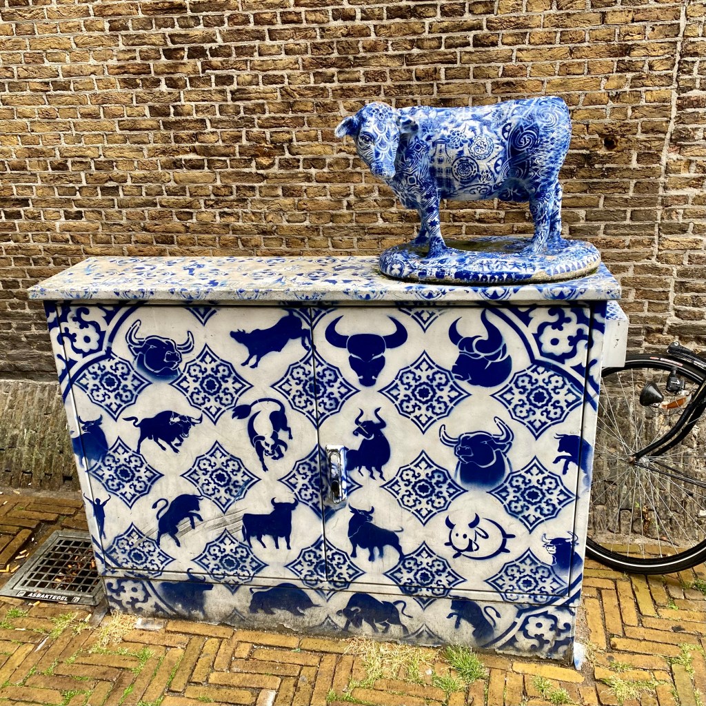 Opposite the Delft blue mural is a transformer box painted in blue and white, topped with “The Colourful Ox”. The striking artwork is by Amsterdam sculptor/street artist Hugo Kaagman.