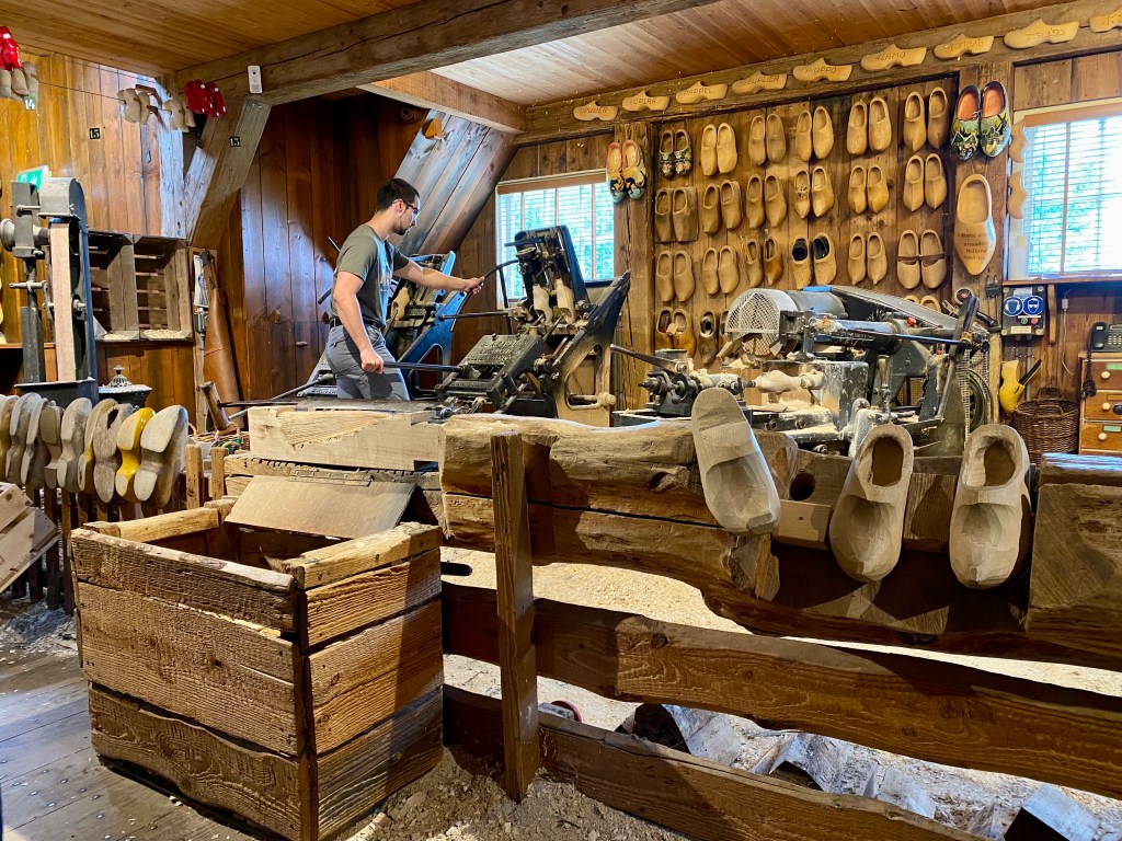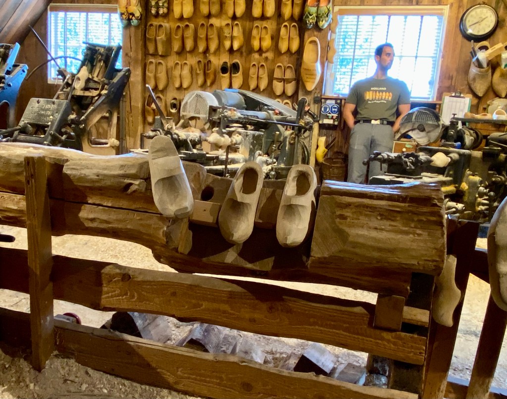 Time to bid adieu to Volendam and head to our last stop, Zaanse Schans to check out the windmills. But first a stop to see how wooden shoes are made. Back in the day, it would take 3 or 4 days to carve a pair but with the new machines the process is more like five minutes. The machines work in much the same way as having a copy of your house key cut with a mold for the outside and another for the inside. Very slick to see a piece of fresh cut poplar turned into a shoe in the time it takes to drink a coffee. It’s not all done by machine though as the heels and toes are still shaped using a large knife. After the shoe has been carved, they are dried for 3-4 weeks and then sanded for a nice smooth finish. They had some beauties there but there no room in my luggage for wooden shoes so I am saved!!