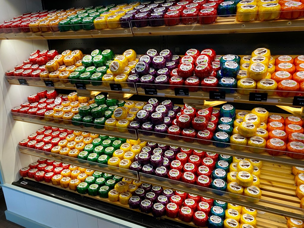 Next stop on the tour was a “farm tour” which was more like a cheese store where we heard the story of Henri Willig and the growth of his cheese empire traditional cheeses that are shipped around the globe. After a brief description of the cheese making process, there were a myriad of cow, goat and sheep milk cheeses to sample in a wide range of flavours. There was even a purple lavender flavoured cheese. Nice colour but not for me! I did, however, take a liking to the extra old goat cheese so I bought some to share with a Chantale next weekend when she joins me in Amsterdam.